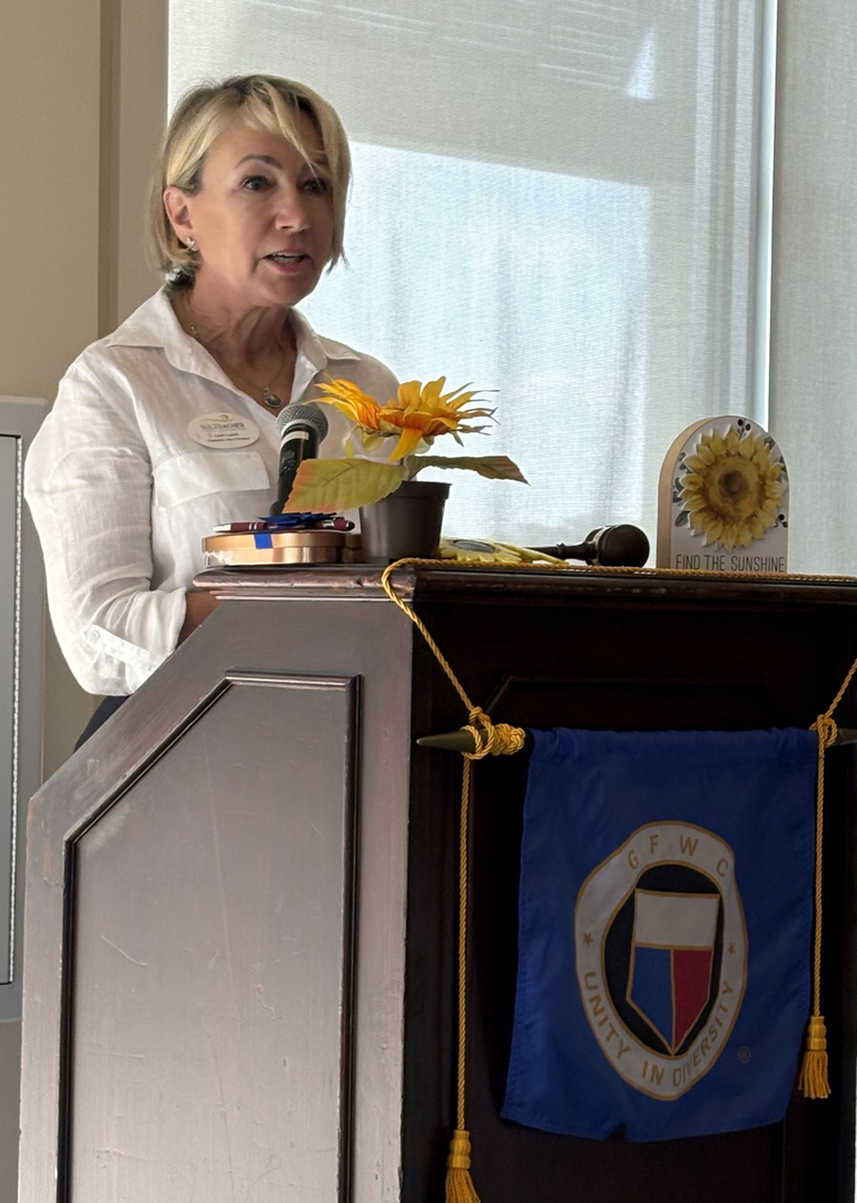 Our President, Jac Littlefield, led the ceremony to induct our new members, 4 of the 5 being present at the meeting: Kathy Scott, Germaine Haga, Karen Gray, and Mary Dixon. Jac asked each member to confirm their obligations as a member of the Club. She gave each a succulent plant, as they are an ideal representation of love. Terry Laws, our GFWC FL D4 Director, presented each new member a sticker for our membership wall of fame. Both the Recruiter/Sponsor and New Member got a sticker from GFWC FL. She reminded everyone of the importance of helping mentor these new members.